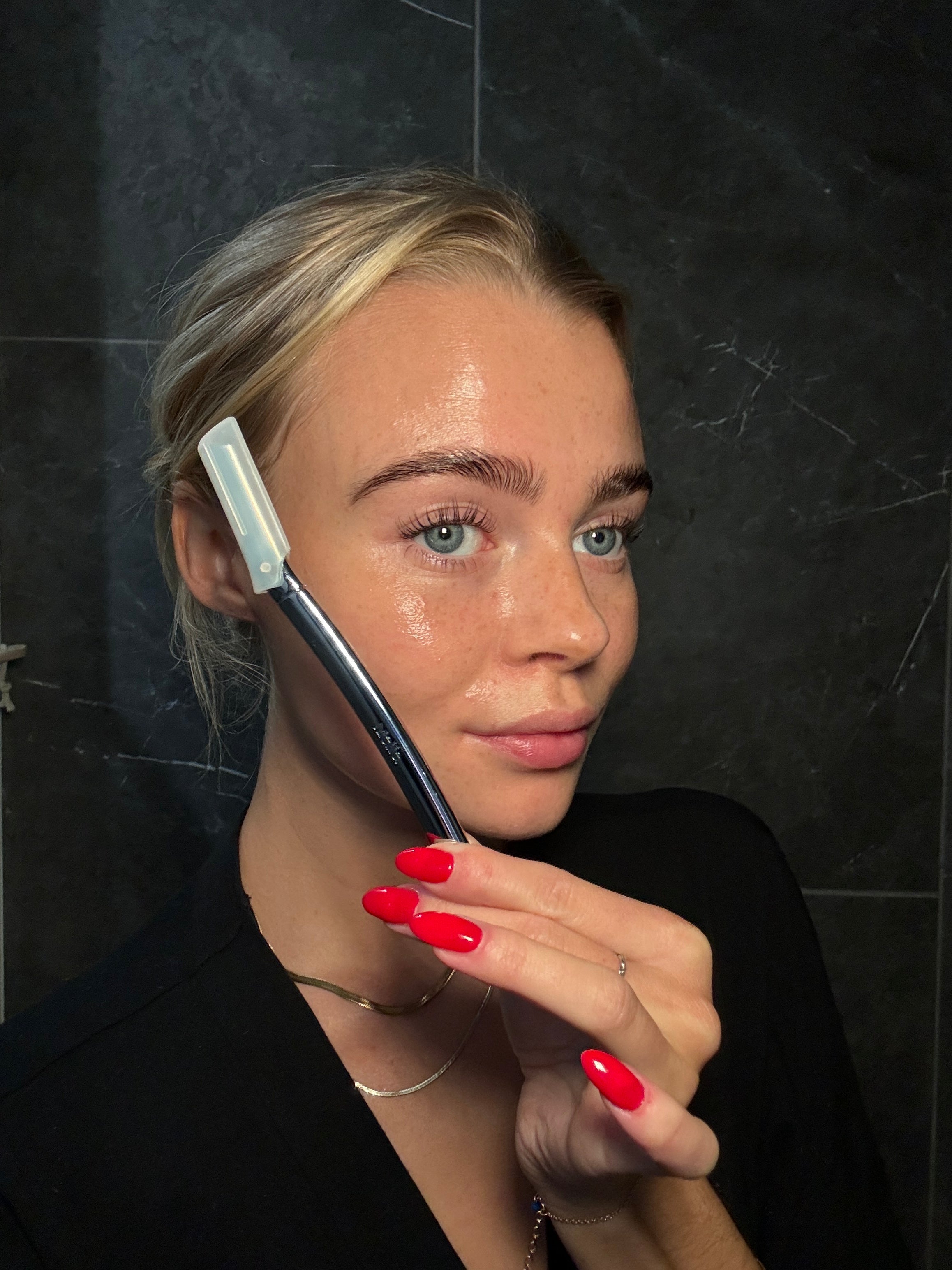 All you need for the ultimate dermaplaning experince. Apply oil to the area you're going to shave. This provides additional glide, facilitating smooth razor movement. Hold the razor correctly and angle the razor at 45° and start at the top of your face near the hairline, moving downward. Use short, downward strokes following the direction of hair growth. Maintain a light touch and avoid going over the same area multiple times to prevent skin irritation.
