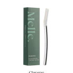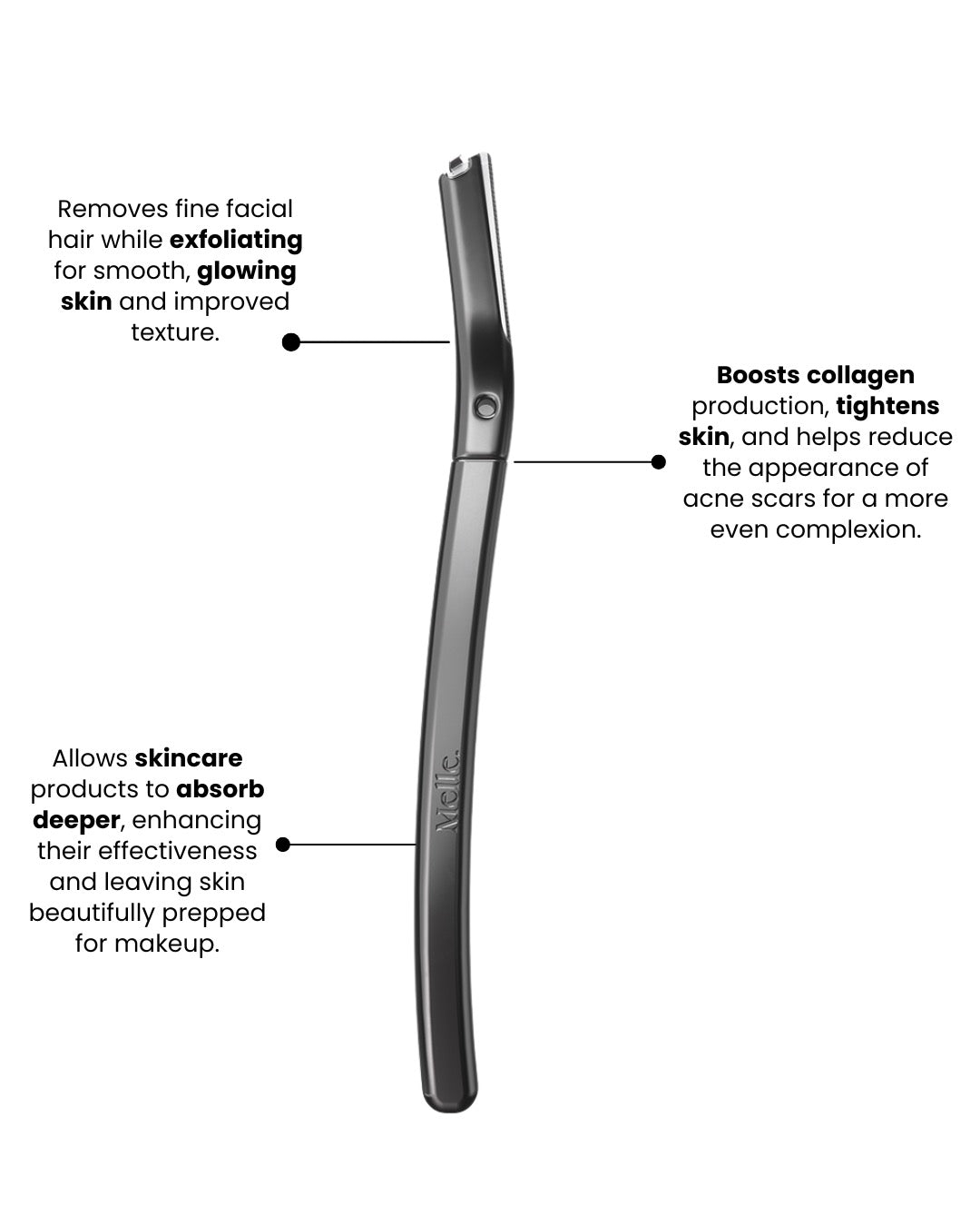 A super sharp, single blade to gently remove the finest of facial hair, smoothing contours and defining brows. The Dermaplaning Razor also exfoliates and resurfaces the skin, improves overall texture and increases skincare ingredient absorption. Kit includes 1x metal handle, 1x razor blade